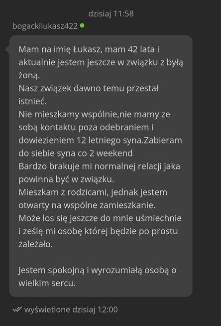 Witam, jak w temacie, jeszcze raz postanowiłam dać szansę losowi na miłość;) Kogo szukam? Mężczyzny dojrzałego, z ...